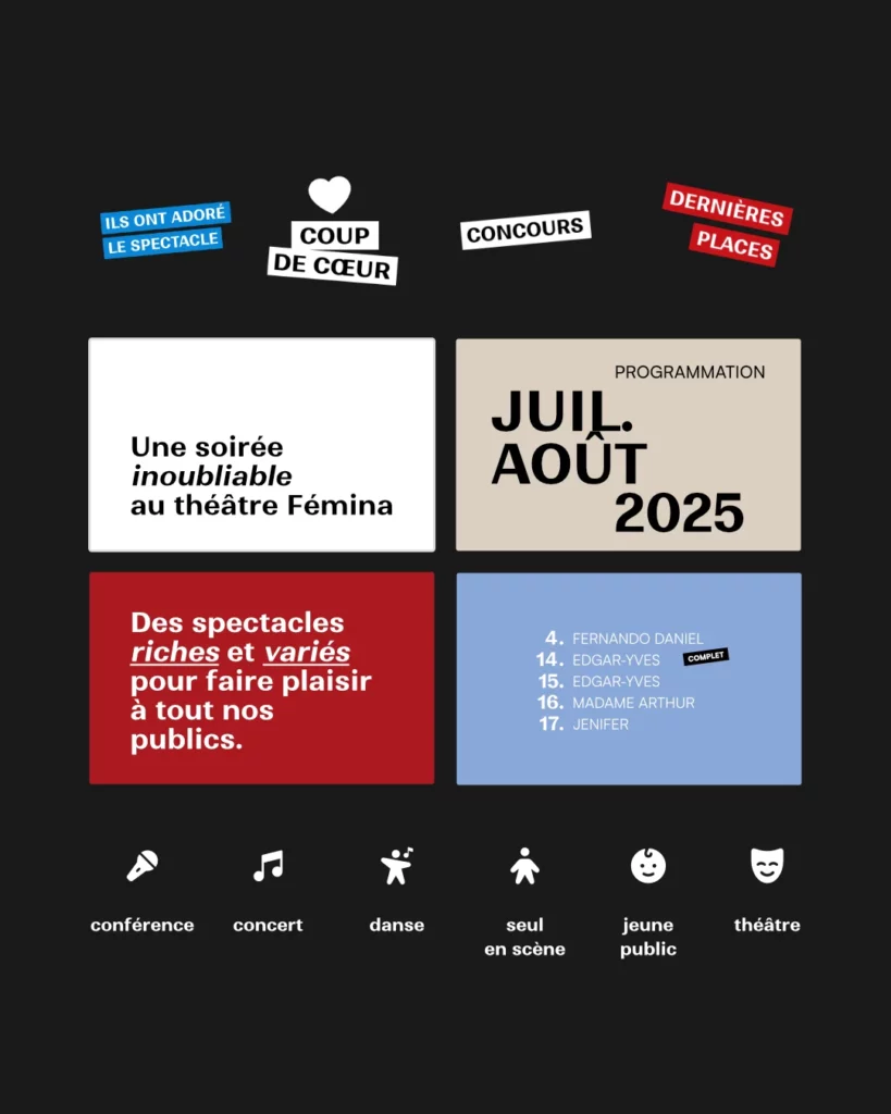 La nouvelle identité a été pensée pour créer une expérience cohérente, chaleureuse et dynamique sur tous les supports. Elle améliore la lisibilité des programmes, renforce l’impact visuel des campagnes et modernise la présence du Fémina sur les réseaux sociaux. Grâce à ses encadrés, pictogrammes, blocs colorés et compositions modulaires, le théâtre gagne en clarté, en énergie et en attractivité.